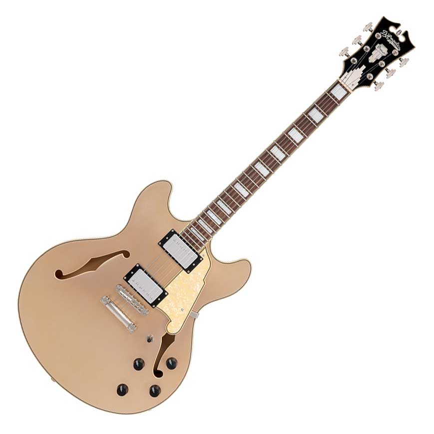 Premier DC Desert Gold【特徴】センターブロック構造をもつ16インチ(406.4mm)幅、1.75インチ(44.45mm)厚のダブルカッタウェイセミホローモデルです。ボディートップ、ヘッドストックとネックにはバインディングが装飾され、ホワイトパーロイドブロックポジションマーカーと組み合わせた高級感のあるデザインです。メイプルボディー、メイプルネック&ウォルナットフィンガーボード...