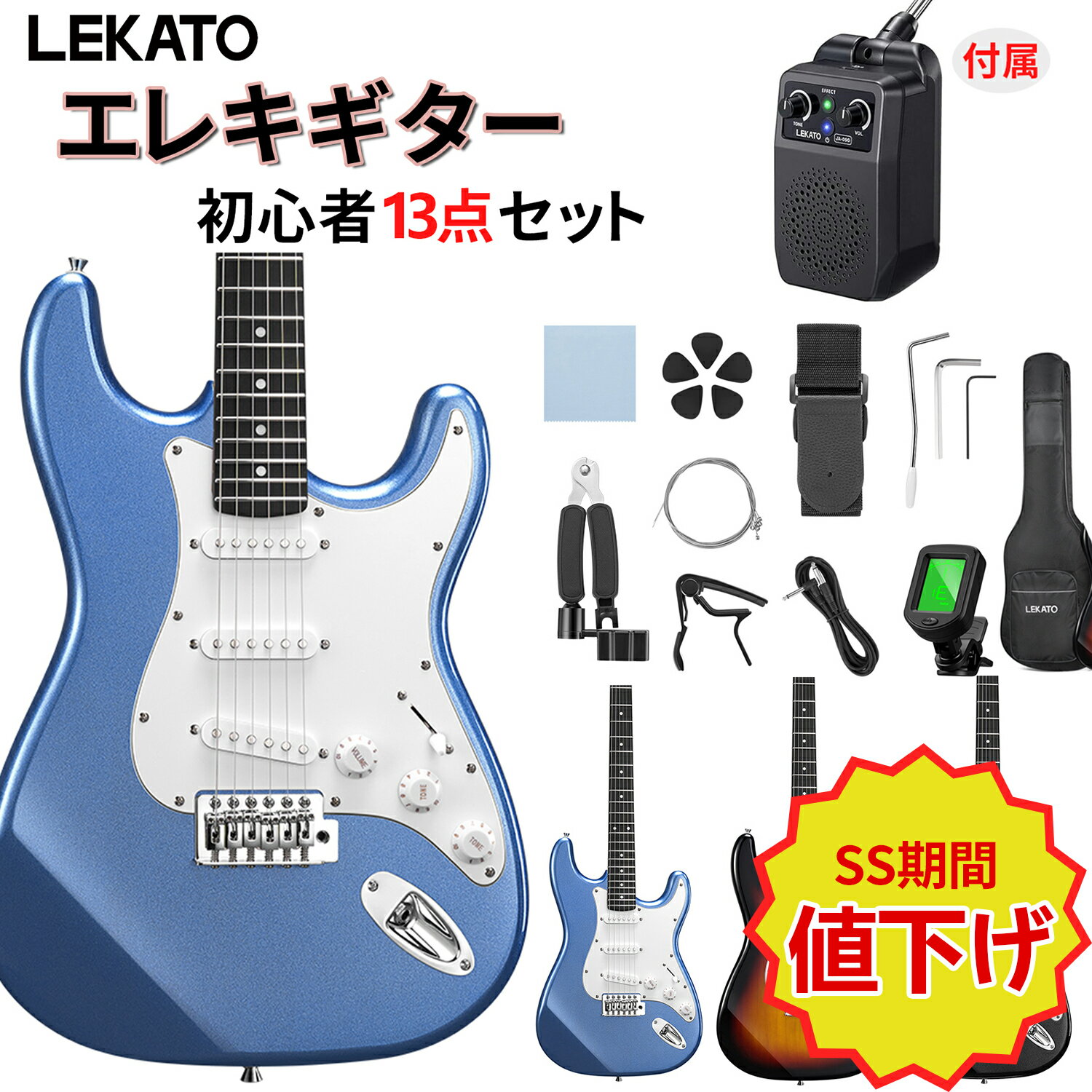 ■【SS】LEKATO エレキギター ST-02 13点セット 初心者 アンプ付属 SSSピックアップ ミニアンプ ソフトケース付き 弾きやすい 入門セット 替え弦 ギフト クリスマス 1年保証 新学期 新生活